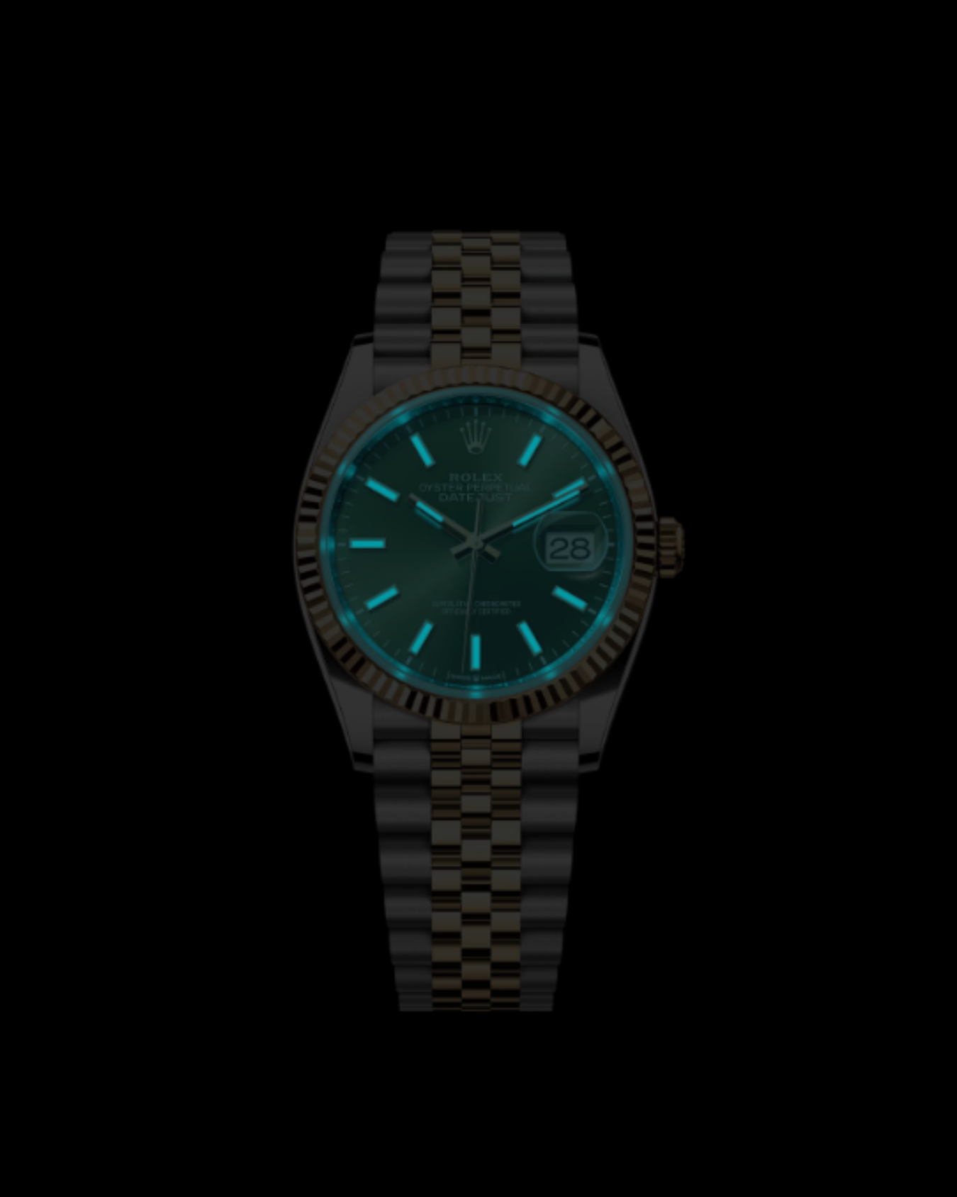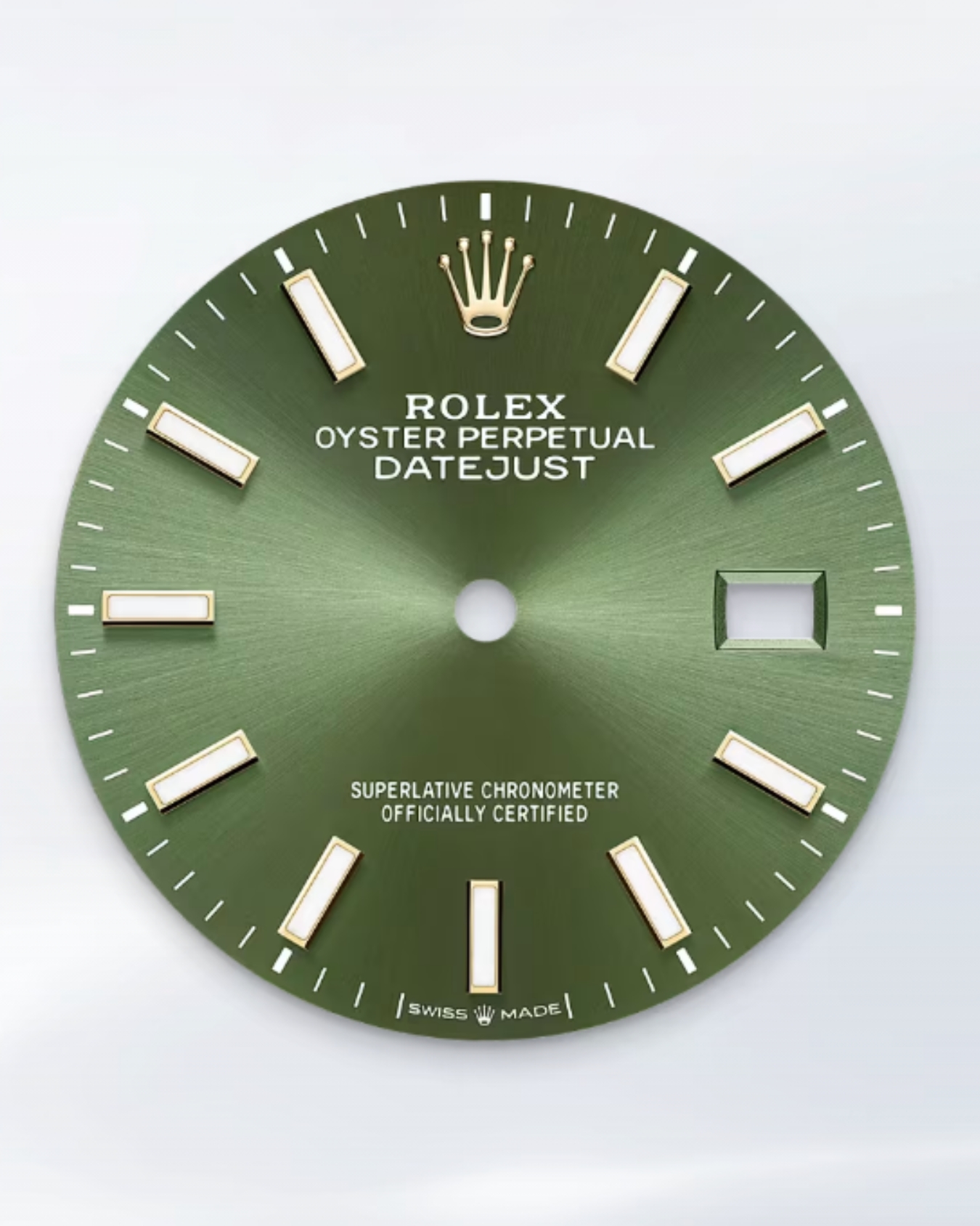 Bằng cách kết hợp sắc vàng 18ct với tông màu Olive Green trầm mặc, Rolex đã tái hiện lại một 'tiêu chuẩn vàng' của giới tinh hoa, nhưng được nâng cấp bằng công nghệ đánh bóng Specularity (Là một kỹ thuật hoàn thiện bề mặt cao cấp trong ngành đồng hồ, giúp tạo ra bề mặt kim loại phẳng mịn, bóng loáng như gương mà không làm biến dạng các đường nét sắc cạnh, kỹ thuật này tạo cảm giác có độ sâu và hình khối rõ ràng, khác với độ bóng nông thông thường) Với cọc số Baton chứa dạ quang Chromalight, mẫu Datejust này không chỉ là một món trang sức, mà là một biểu tượng sống động về sự thành đạt, dành riêng cho những người muốn khẳng định vị thế của mình bằng ngôn ngữ của những huyền thoại