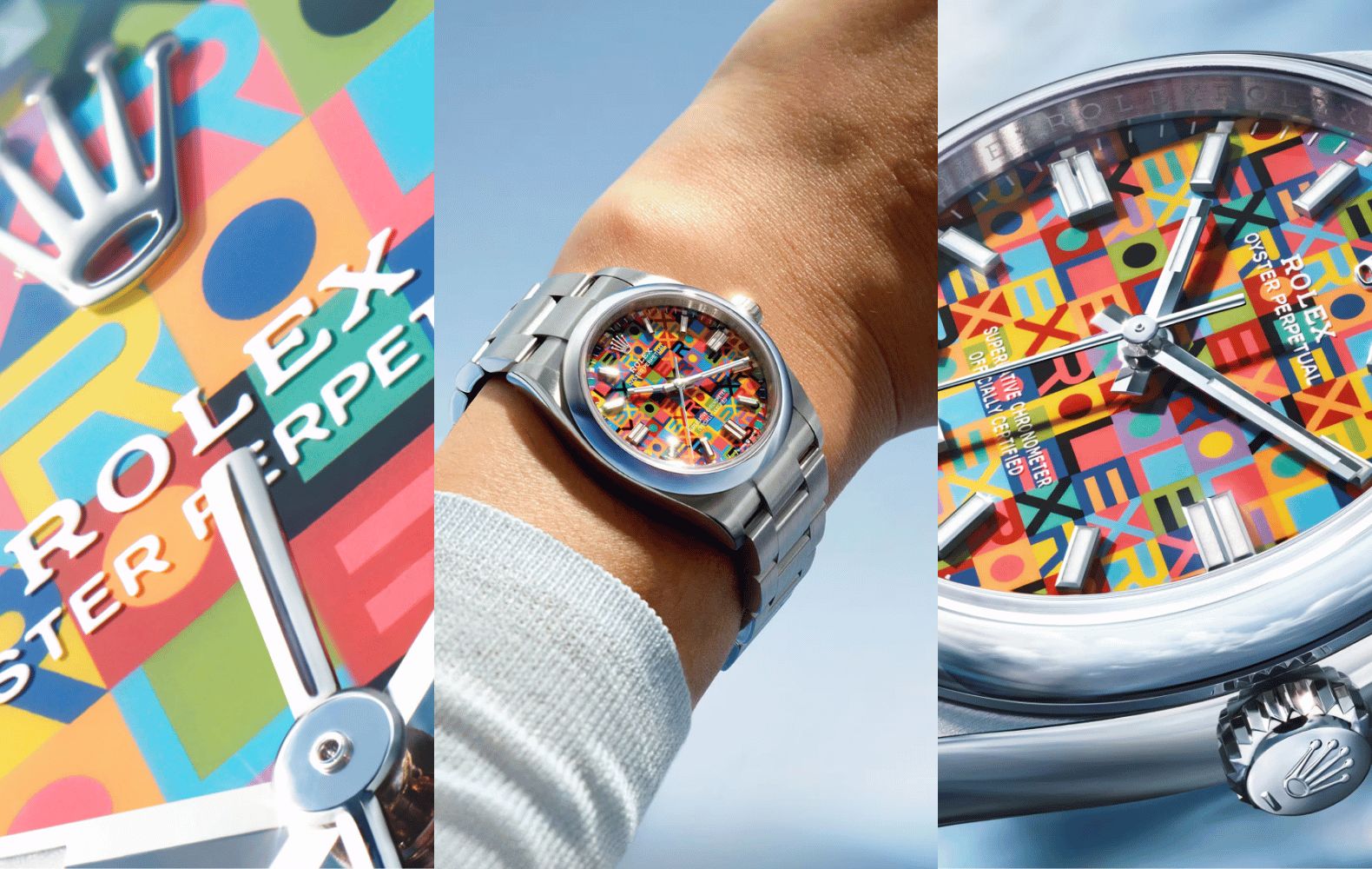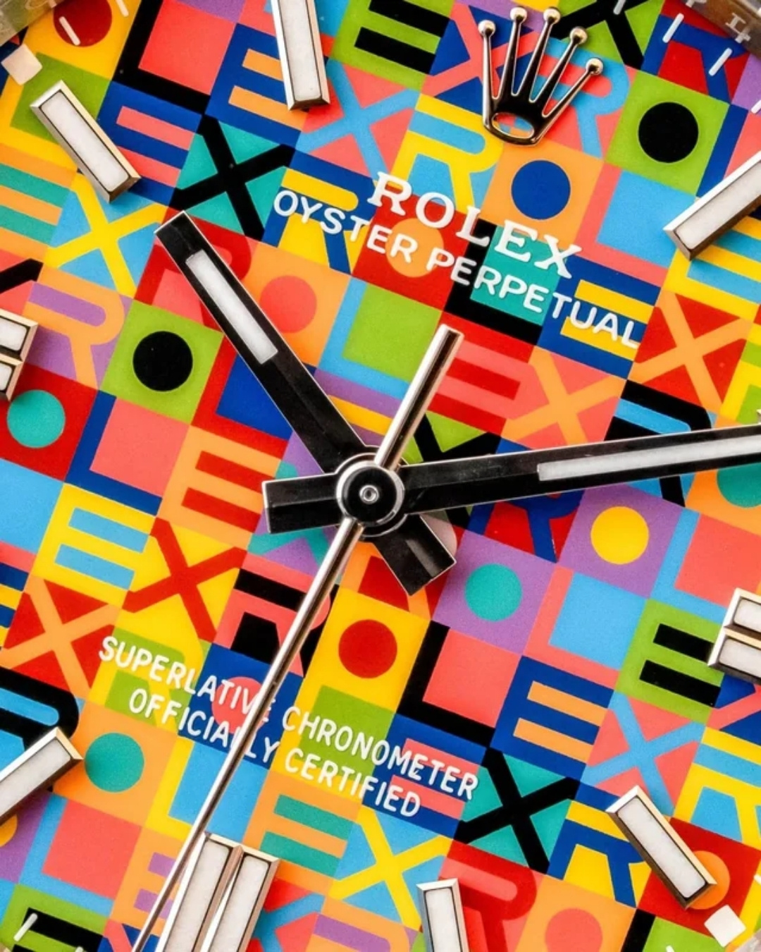 Tương phản giữa "Cổ điển" và "Hiện đại": Các cọc số (indices) bằng vàng trắng, kim đồng hồ và logo vương miện Rolex được đặt trên một nền hoa văn Pop-art cực kỳ hiện đại. Sự tương phản này làm nổi bật tính di sản của thương hiệu giữa một thiết kế phá cách