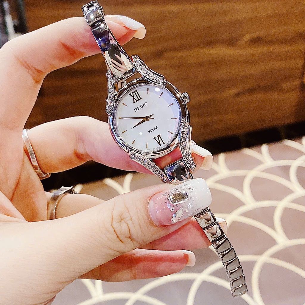 Mặt đồng hồ màu trắng trang nhã, cùng lớp viền đính đá lấp lánh, tạo nên sự quý phái và nổi bật. Các cọc số La Mã ở vị trí 12 giờ và 6 giờ mang phong cách cổ điển, kết hợp với kim chỉ giờ mảnh mai màu vàng, làm tăng thêm sự tinh xảo. Dây đeo làm từ kim loại sáng bóng với các mắt xích nhỏ, mang lại cảm giác nhẹ nhàng và thoải mái khi đeo. Đây là mẫu đồng hồ chạy bằng năng lượng mặt trời (Solar), vừa hiện đại vừa thân thiện với môi trường, rất phù hợp để làm phụ kiện thời trang hàng ngày hoặc trong các dịp đặc biệt.