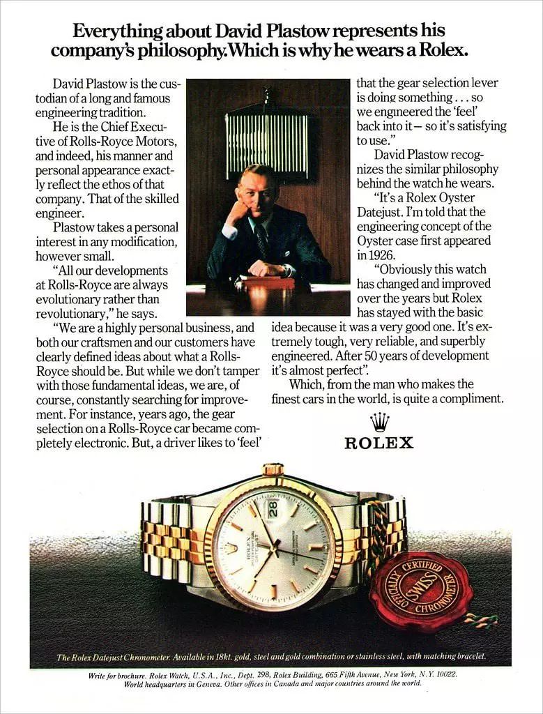 Rolex đã xây dựng nên một hào quang của sự độc quyền và uy tín qua nhiều năm. Mối liên hệ lâu dài của thương hiệu với thành tựu, thành công và sự sang trọng đã củng cố vị thế của nó như một thương hiệu được khao khát và thèm muốn bậc nhất