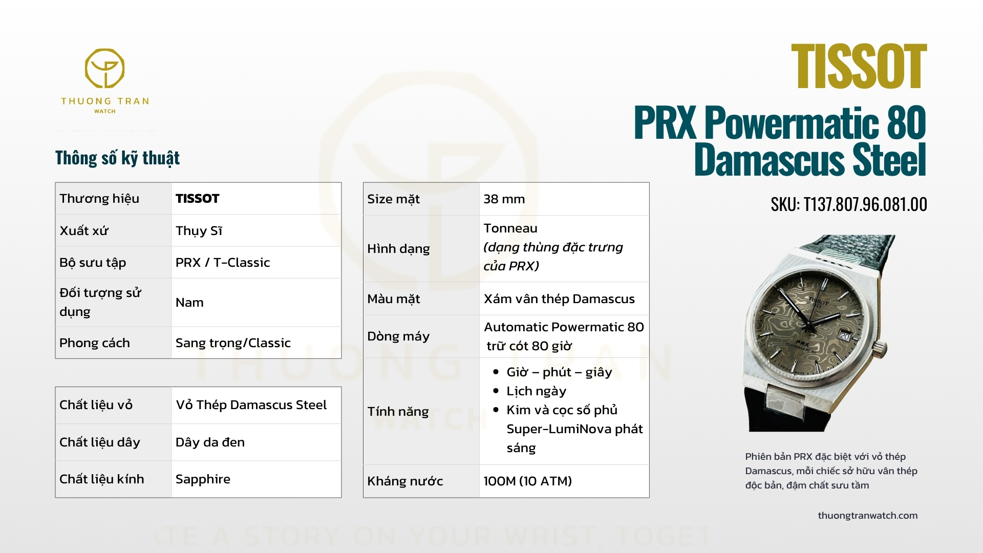 Tissot PRX Powermatic 80 Damascus Steel – T137.807.96.081.00 hiện có tại THUONG TRAN WATCH - cửa hàng chuyên cung cấp đồng hồ chính hãng với dịch vụ tư vấn tận tâm, minh bạch về giá, mang đến trải nghiệm mua sắm an tâm và đáng tin cậy cho khách hàng
