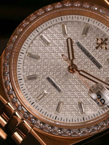 Chiếc Alexander Ferros 8181 sở hữu dây kim loại chắc chắn, mát tay, mang lại cảm giác vừa vặn và thoải mái khi đeo cả ngày dài. Mặt kính sapphire không chỉ chống trầy mà còn phản chiếu ánh sáng tinh tế, tạo chiều sâu cho mặt số. Bộ máy automatic hoạt động êm ái, luôn giữ nhịp chuẩn với sinh hoạt thường nhật mà không cần pin – một điểm cộng lớn cho người dùng yêu công nghệ cơ khí.