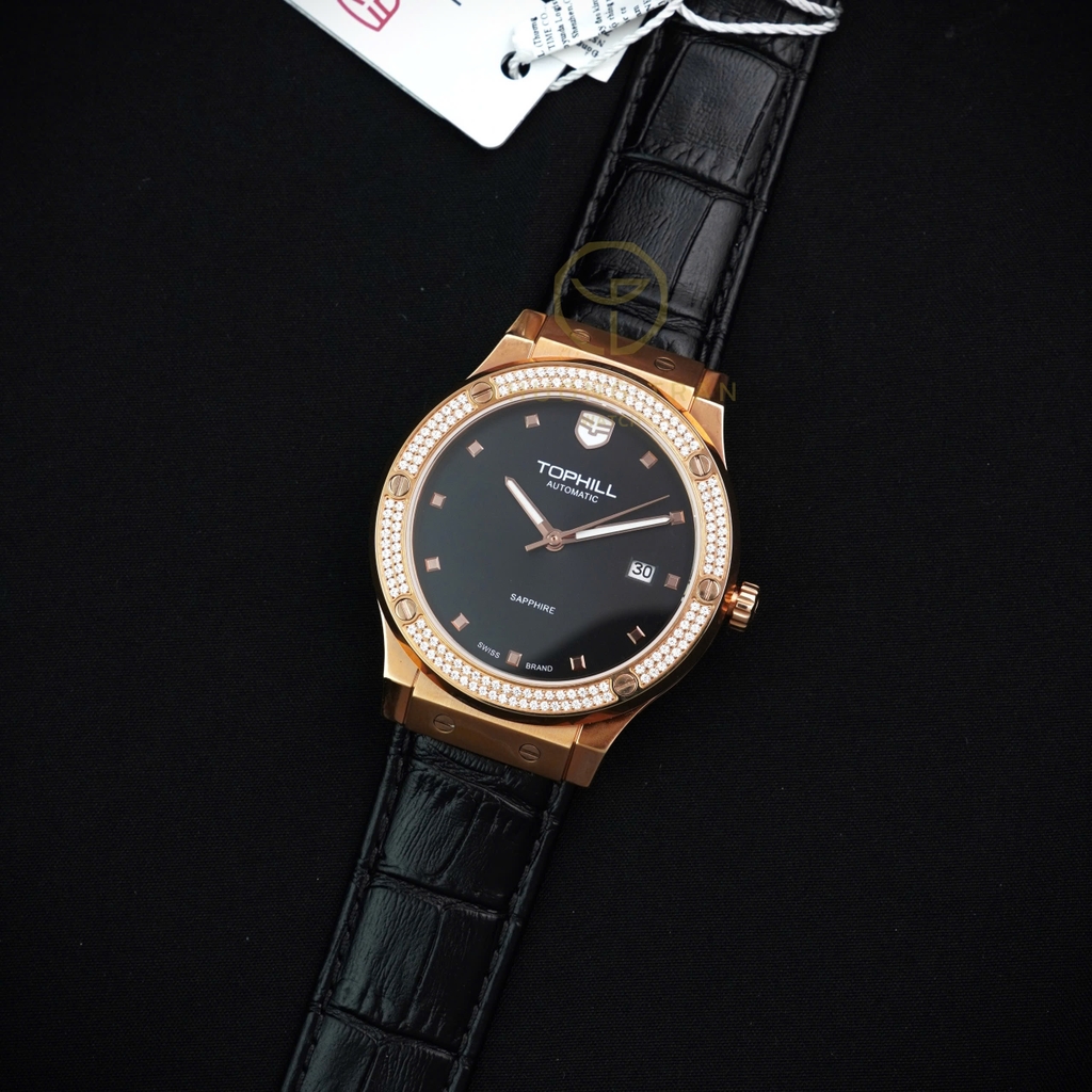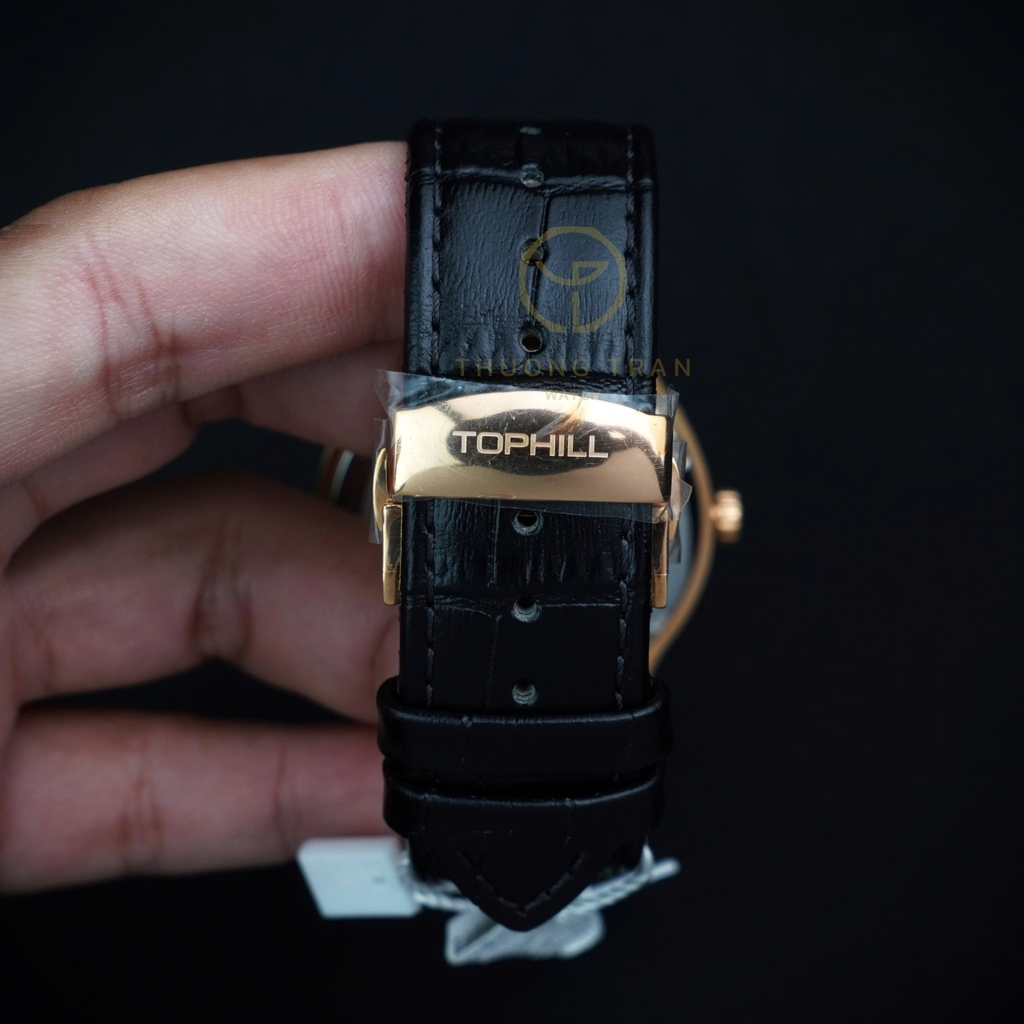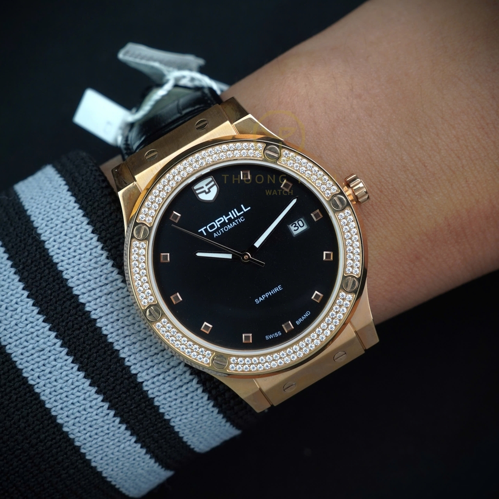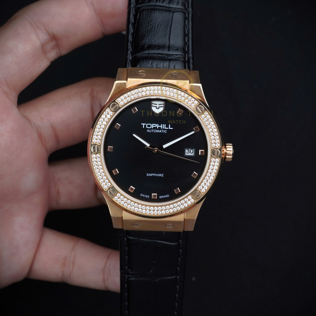 TOPHILL TA053G.MB3152 là mẫu đồng hồ nam đầy phong cách với thiết kế mạnh mẽ và hiện đại. Mặt số đen sang trọng, kết hợp với khung viền vàng hồng cùng các chi tiết vặn ốc mang lại vẻ đẹp nam tính và lịch lãm. Dây đeo kim loại mắt xích màu đen, chắc chắn và bền bỉ, tạo cảm giác vững chãi trên cổ tay. Với mặt kính sapphire chống xước và tính năng tự động lên dây cót, đây là sự lựa chọn hoàn hảo cho những quý ông yêu thích sự tinh tế và đẳng cấp trong từng chi tiết.