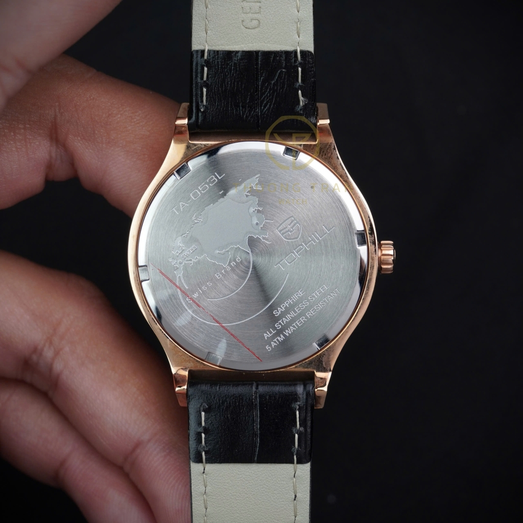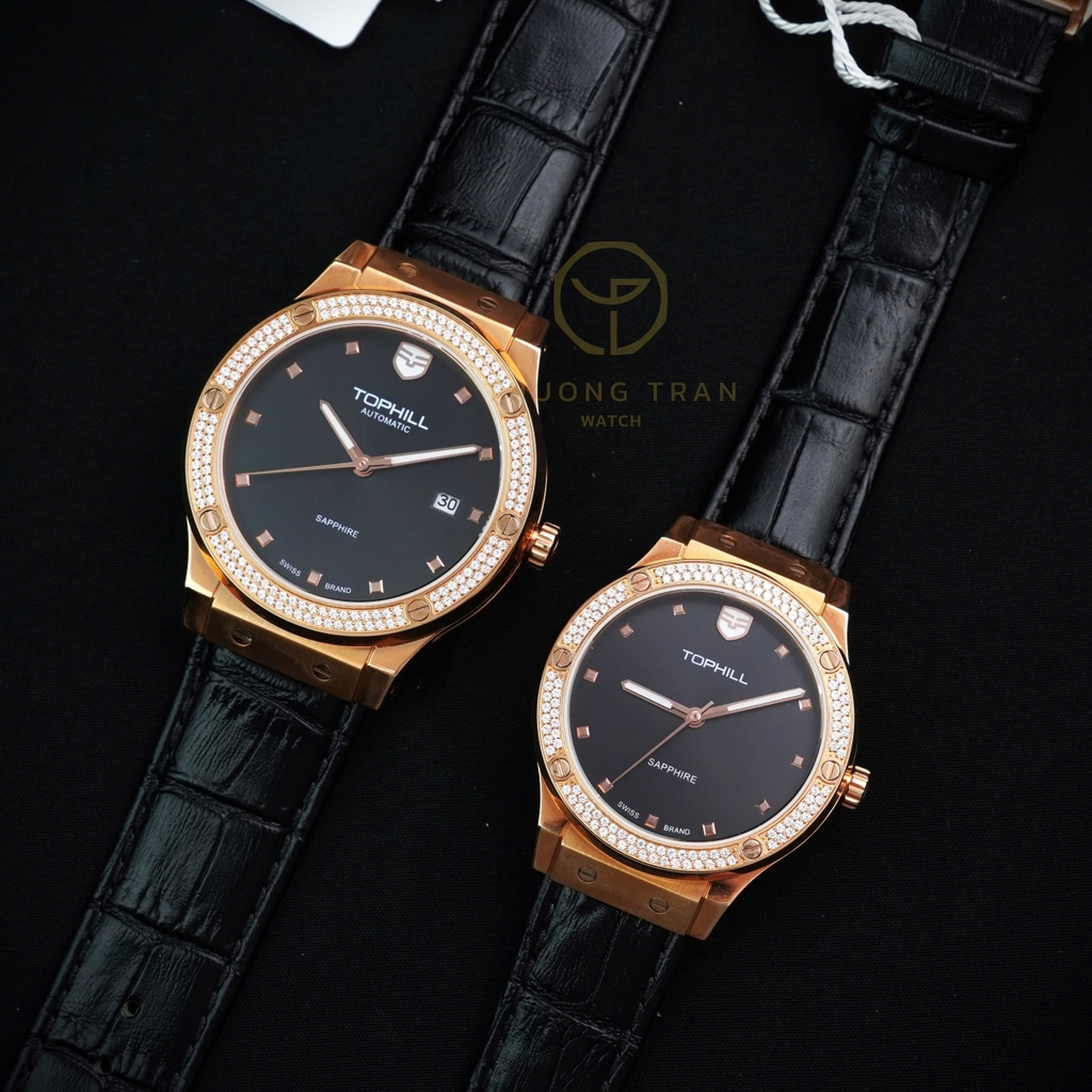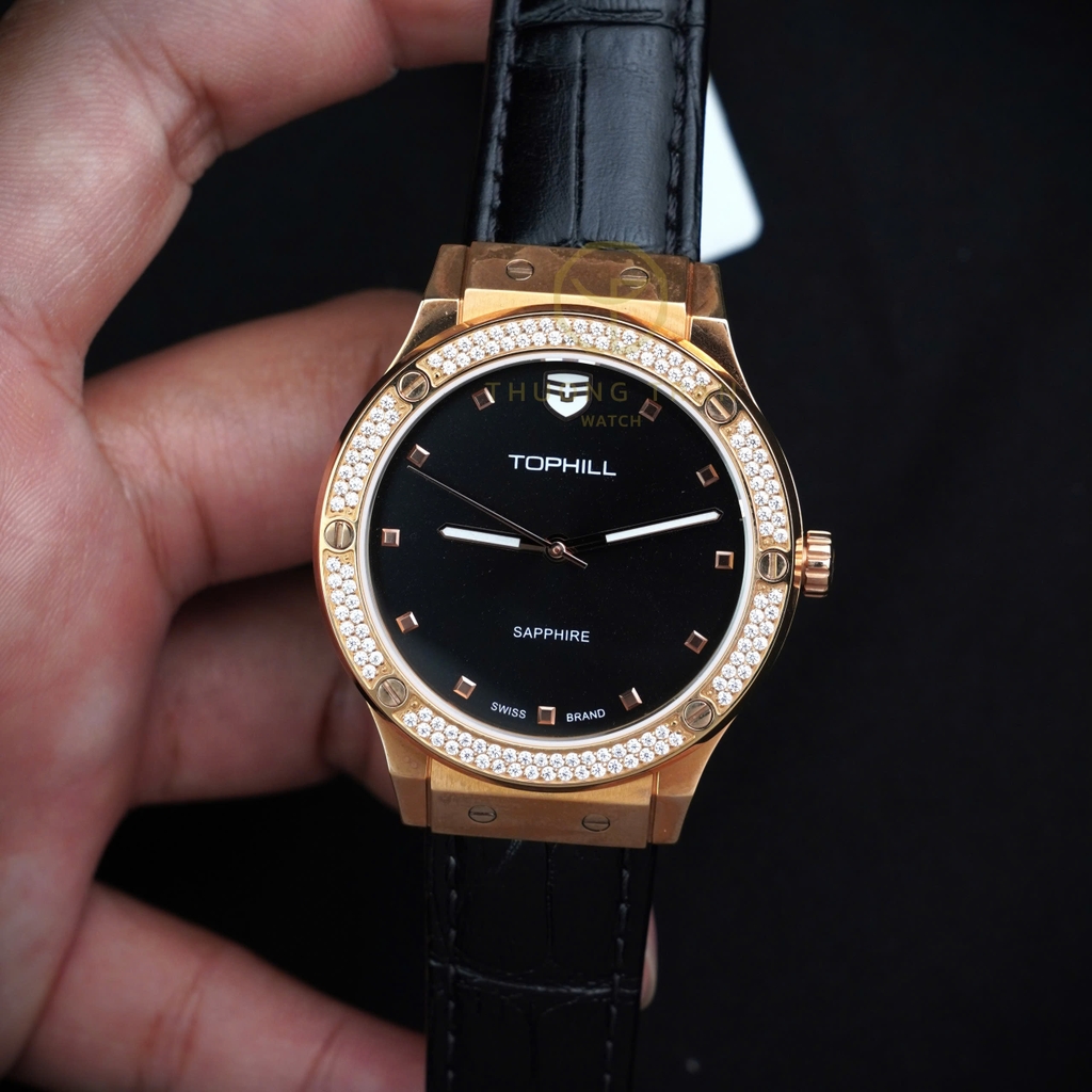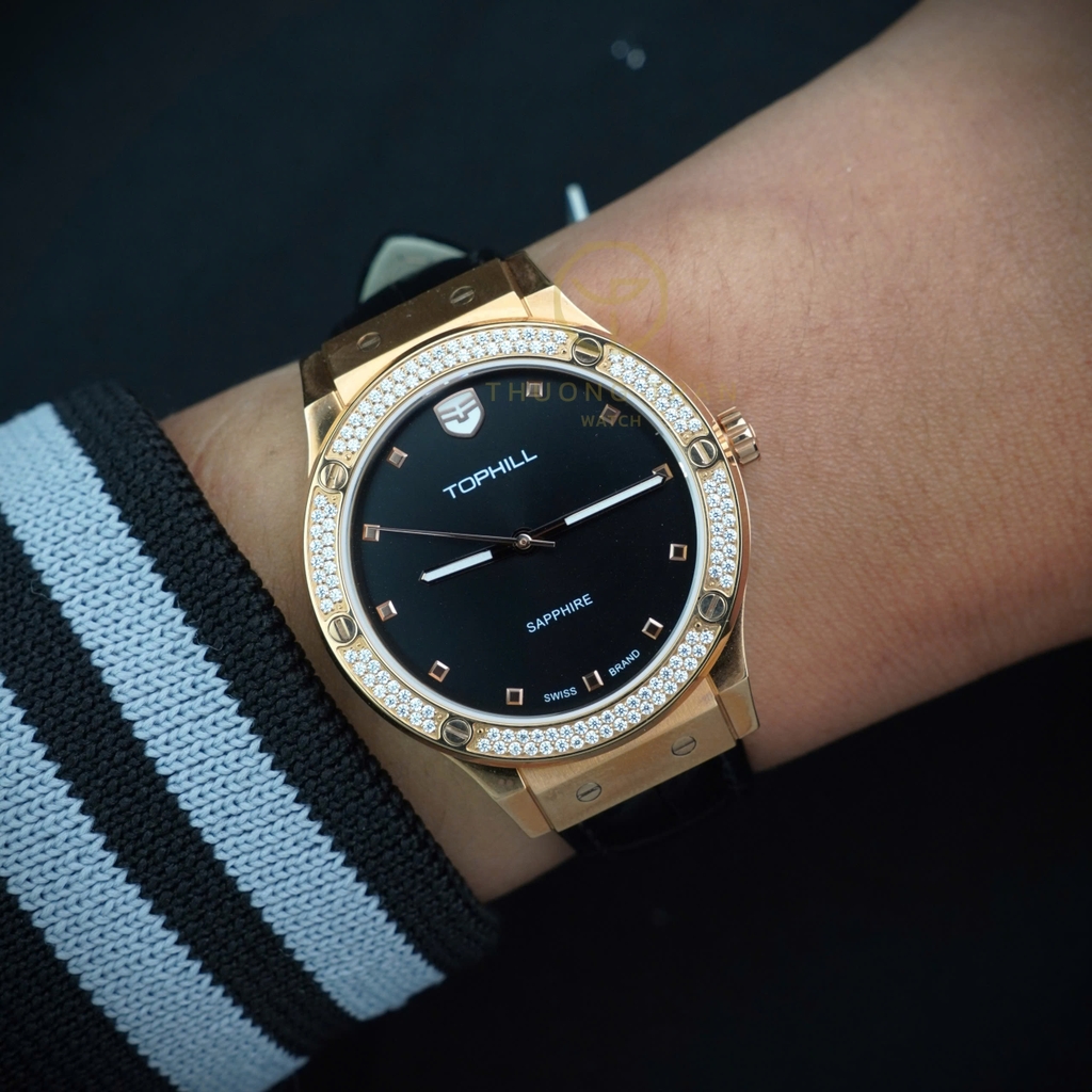 TOPHILL TA053L.MB3152 là mẫu đồng hồ nữ đầy quyến rũ với thiết kế thanh lịch và sang trọng. Mặt số đen quý phái, kết hợp với viền vàng hồng tinh tế, tạo nên sự hòa quyện hoàn hảo giữa nét đẹp cổ điển và hiện đại. Dây đeo kim loại màu đen được chế tác tỉ mỉ, ôm sát cổ tay mang đến cảm giác thoải mái và bền bỉ. Mặt kính sapphire chống xước, cùng bộ máy tự động chất lượng, đảm bảo độ chính xác và bền bỉ. Đây là lựa chọn hoàn hảo cho những quý cô yêu thích phong cách thanh lịch và đẳng cấp.