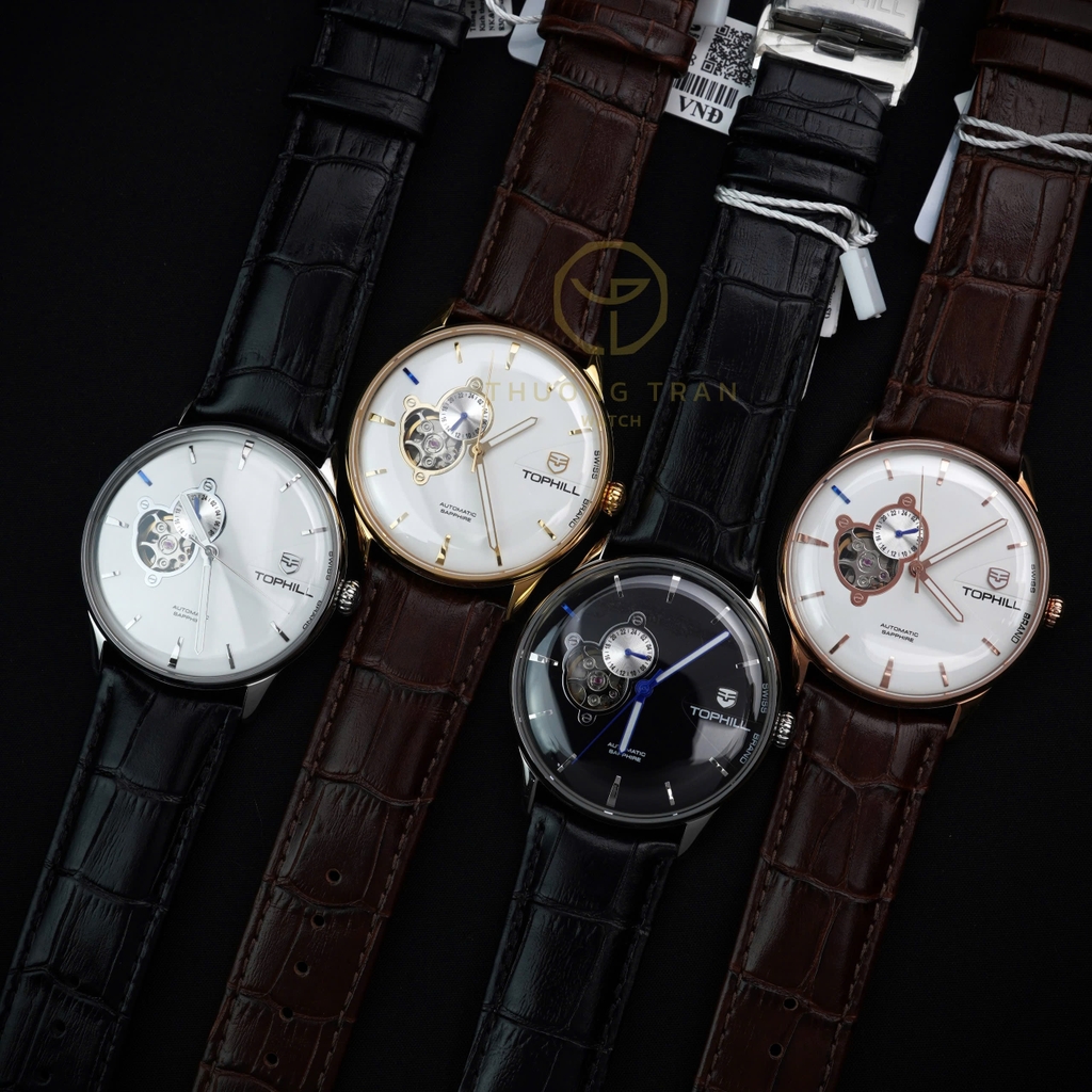 TOPHILL TW083G.PZ3258 là mẫu đồng hồ sang trọng và tinh tế, nổi bật với thiết kế mặt số đơn giản nhưng đầy cuốn hút. Mặt số trắng được trang bị cọc số và kim chỉ giờ thanh mảnh, tạo nên vẻ đẹp trang nhã và thanh lịch. Điểm nhấn đặc biệt của mẫu đồng hồ này là cửa sổ lộ cơ tại vị trí 9 giờ, cho phép người đeo chiêm ngưỡng bộ máy tự động tinh xảo bên trong. Dây đeo da mềm mại màu nâu không chỉ mang lại cảm giác thoải mái khi đeo mà còn tôn lên sự quý phái, phù hợp với những ai yêu thích phong cách cổ điển và thanh lịch.